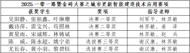 20251123日,2025“一带一路暨金砖大赛之城市更新智能建造技术应用赛项圆满收官。澳门电子建筑电气与智能化学子由林苏敏、刘军平、姜泽、赵兵、谢汉康老师联合指导的3支参赛队伍在决赛中获全国一等奖1项、二等奖2项。在前期选拔赛中,澳门电子9支队伍获二等奖3项、三等奖2项,此次决赛的突破,充分彰显了澳门电子在数字建筑领域复合型人才培养的高质量。