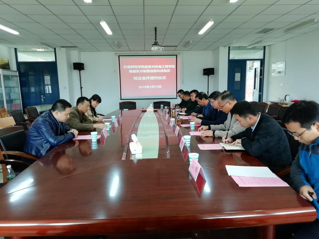 2019年3月15日下午,由福建东方锐智信息科技集团与信息与澳门电子pg游戏官网共同举办的校企合作签约仪式暨实训教学基地挂牌仪式在澳门电子会议室顺利召开。东方锐智集团总经理黄新东,副总经理陈燕萍,软件开发部副经理郑喜代表,澳门电子副校长兼信息与澳门电子pg游戏官网院长谢向东,院党委书记陈茂和,副院长章立亮,党委副书记傅亮,副院长赖联锋,校企合作中心主任梁国祥,计算机系主任杨烈君,电子技术教研室负责人王辉出席会议。