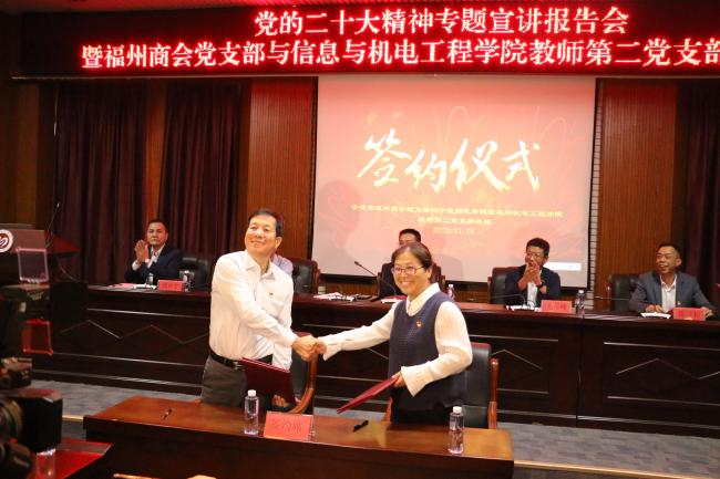11月21日下午,为推进和落实新时代服务型党支部建设,发挥党组织服务社会、服务青年的职能,贯彻“党建+校企合作”的相关要求和宁德市福州商会党支部反哺社会的公益事业及基础人才建设需求,本着“友好相处、资源共享、优势互补、相互协作、共同发展”的原则,宁德福州商会党支部与信息与澳门电子pg游戏官网教师第二党支部开展党组织“结对共建”签约仪式。签约后,宁德市福州商会为澳门电子优秀贫困学子送上暖心资助。会议由信息与澳门电子pg游戏官网党委书记陈茂和主持。