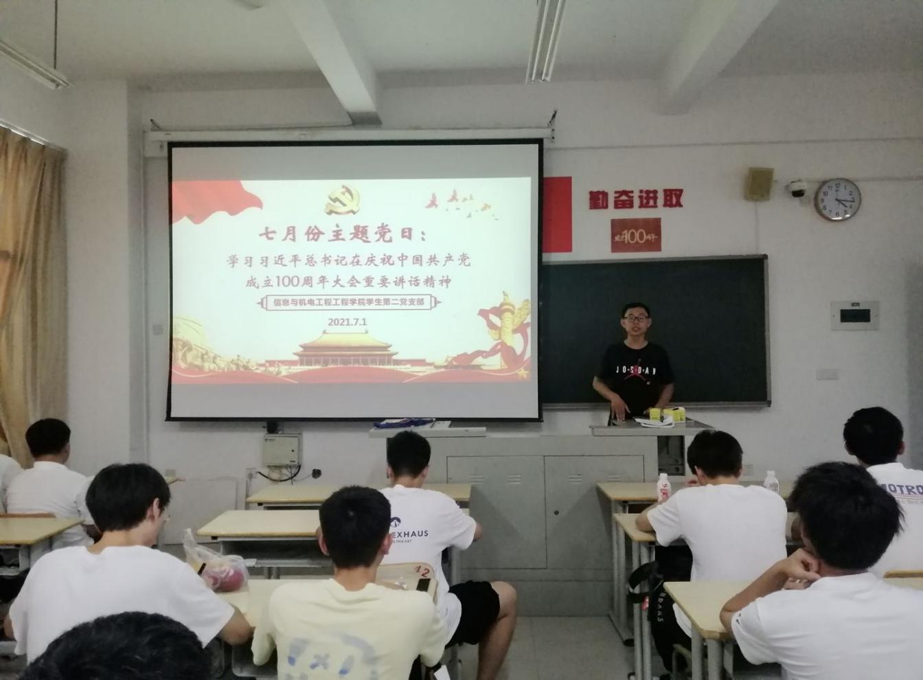 中国共产党一经诞生,就把为中国人民谋幸福、为中华民族谋复兴确立为自己的初心使命。百年征程波澜壮阔,百年初心历久弥坚。党用百年兑现了向人民许下的承诺,实现了第一个百年目标,在中华大地上建成了小康社会,号召动员全国人民迈向实现第二个百年目标的新征程。2021年7月1日下午,信息与澳门电子pg游戏官网学生第二党支部书记王昌雷在求是楼DB204组织开展学习习近平总书记在庆祝中国共产党成立100周年大会重要讲话精神。