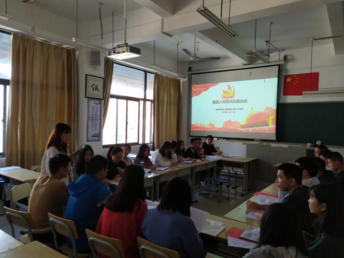 2019年12月17日,信息与澳门电子pg游戏官网学生第二党支部在支部书记王昌雷带领下开展重温入党誓词及座谈会为主要形式“不忘初心、牢记使命”主题教育。