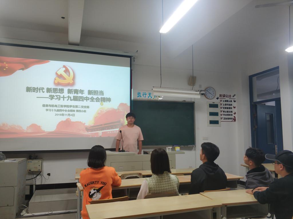 11月2日,信息与澳门电子pg游戏官网第二党支部书记王昌雷老师要求全体学生党员带领积极分子通过学习强国、新华网、中国共产党网等渠道采用自学和小组讨论等方式学习这次会议的重要内容。11月12号下午三点在DB203召开全体党员学习十九届四中全会的讨论总结会。此次总结会以9个小组的学习成果分享为主,各组代表分别阐述了各小组内的学习心得。党员一致认为,十九届四中全会胜利召开,审议通过了《中共中央关于坚持和完善中国特色社会主义制度、推进国家治理体系和治理能力现代化若干重大问题的决定》,对坚持和完善中国特色社会主义制度,进一步推进国家治理能力、治理体系现代化具有决定性的重要作用。“青年兴则国家兴,青年强则国家强。青年一代有理想、有本领、有担当,国家就有前途,民族就有希望。”作为新时代的当代党员大学生,我们一定坚定理想信念,牢固树立“四个意识”,坚定“四个自信”,做到“两个维护”,志存高远,脚踏实地,勇做时代的弄潮儿,在实现中国梦的生动实践中放飞青春梦想,在为人民利益的不懈奋斗中书写人生华章!