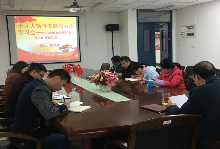 为了深入学习宣传贯彻党的十九大精神,信息与澳门电子pg游戏官网党委于2017年12月13日上午召开了第5次理论中心组(扩大)学习会议,信息与澳门电子pg游戏官网党委书记陈茂和书记为参会人员做了主题为《深刻理解和把握十九大报告的精髓和要义》的学习会。信息与澳门电子pg游戏官网党委委员、科级干部、各支部书记及辅导员参加了会议。