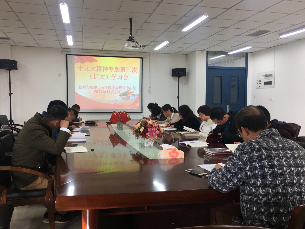 为了深入学习宣传贯彻党的十九大精神,信息与澳门电子pg游戏官网党委于2017年11月28日下午召开了第3次理论中心组(扩大)学习会议,进一步深入学习党的十九大精神,交流学习贯彻党的十九大精神心得。信息与澳门电子pg游戏官网党委书记陈茂和主持会议并讲话,信息与澳门电子pg游戏官网党委副书记傅亮、各科室部门科级干部以及各党支部书记和辅导员共十二人参加了会议。会上计算机系教师第一党支部书记吴玉芹、计算机系学生党支部书记王秋菊先后就自身学习贯彻党的十九大精神的心得体会进行了发言。接着,与会人员分别原原本本学习了十九大报告的第六部分至第八部分。最后陈茂和同志就今后如何深入学习宣传贯彻十九大会议精神提出了几点要求。