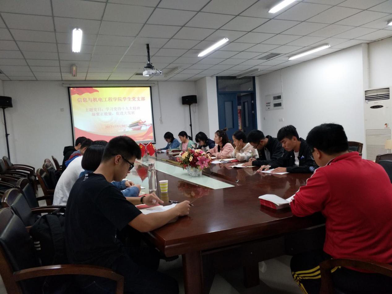 为进一步统一思想、凝聚共识,教育引导信息与澳门电子pg游戏官网机电系学生党支部全体党员不忘初心、牢记使命,把十九大精神转化为强大动力。2017年11月14日下午,机电系学生党支部全体师生党员在求是楼DA408会议室参加了“学习党的十九大精神,凝聚正能量,促进大发展”主题党日活动。