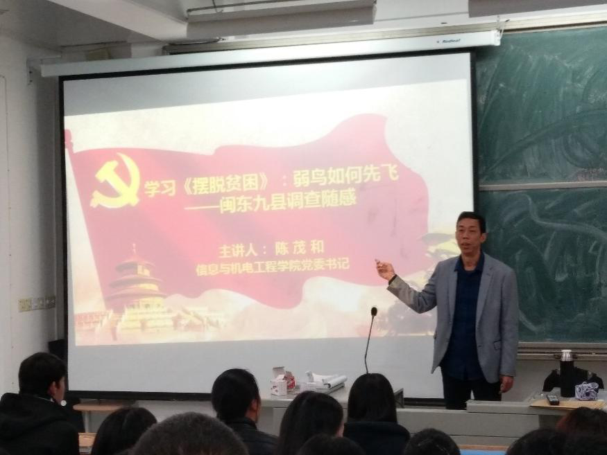 为号召2017级新生积极参与到学习《摆脱贫困》中来,11月8日晚,信息与澳门电子pg游戏官网党委陈茂和书记在求是楼B201教室为2017级新生开展题为“学习《摆脱贫困》:弱鸟如何先飞——闽东九县调查随感”的主题党课。