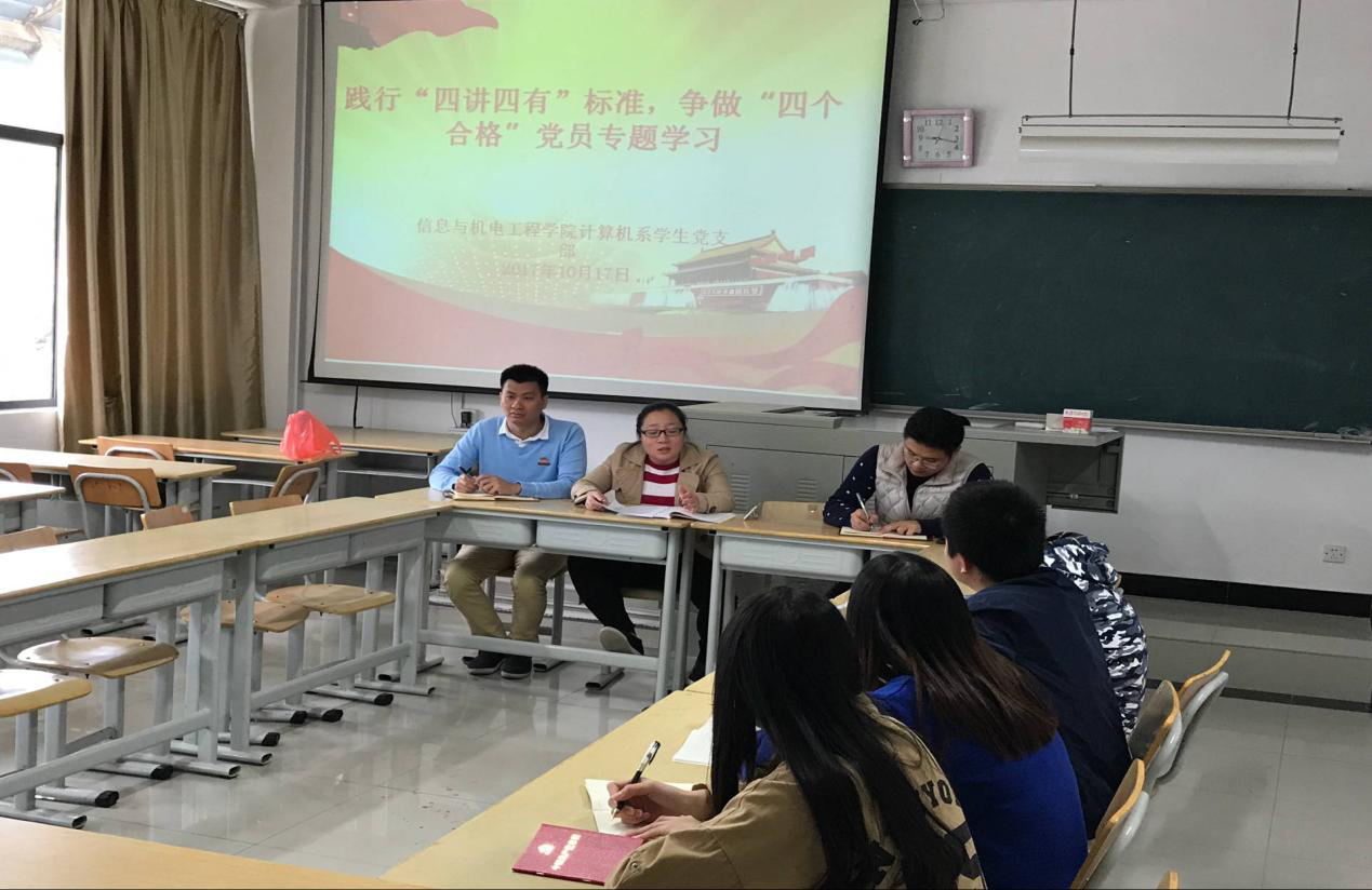 2017年10月17日,信息与澳门电子pg游戏官网计算机系学生党支部在DB407召开全体党员大会,践行“四讲四有”标准,争做“合格党员”主题党日活动。“四讲四有”高度概括了新时期合格共产党员应该具备的政治要求、道德要求、纪律要求、行为要求,是具有深刻内在联系的辩证统一体。践行“四讲四有”合格党员标准,每个党员要把自身思想政治建设放在首位,解决自身存在的理想信念模糊、党的意识淡化、党员宗旨淡薄的问题。通过学习,全体党员领会了精神实质、学会科学方法、解决现实问题,最终实现从学入思、从思导行,做思想建党的引领者。同时,“四讲四有”是我们党对党员提出的新要求,是规范和衡量每个党员是否合格的基本尺度,是新时期广大党员以知促行、知行合一的行动指南。