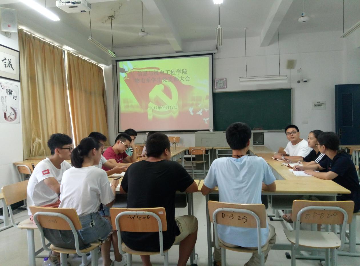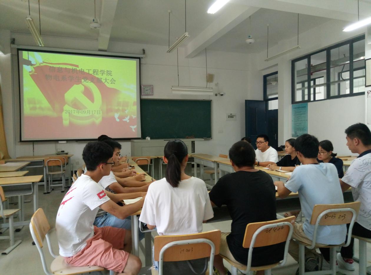 2017年9月17日下午,信息与澳门电子pg游戏官网物理程系学生党支部全体党员在DB407教室召开会议,本次会议由学生党支部书记卓敏主持召开。会议上卓敏老师指出学生党员必须要树立起带好头的作用,不管是在学习上还是在生活上都要给周围的同学树立好榜样。要不断提升自身的党性修养,更好的发挥党员先锋模范作用。