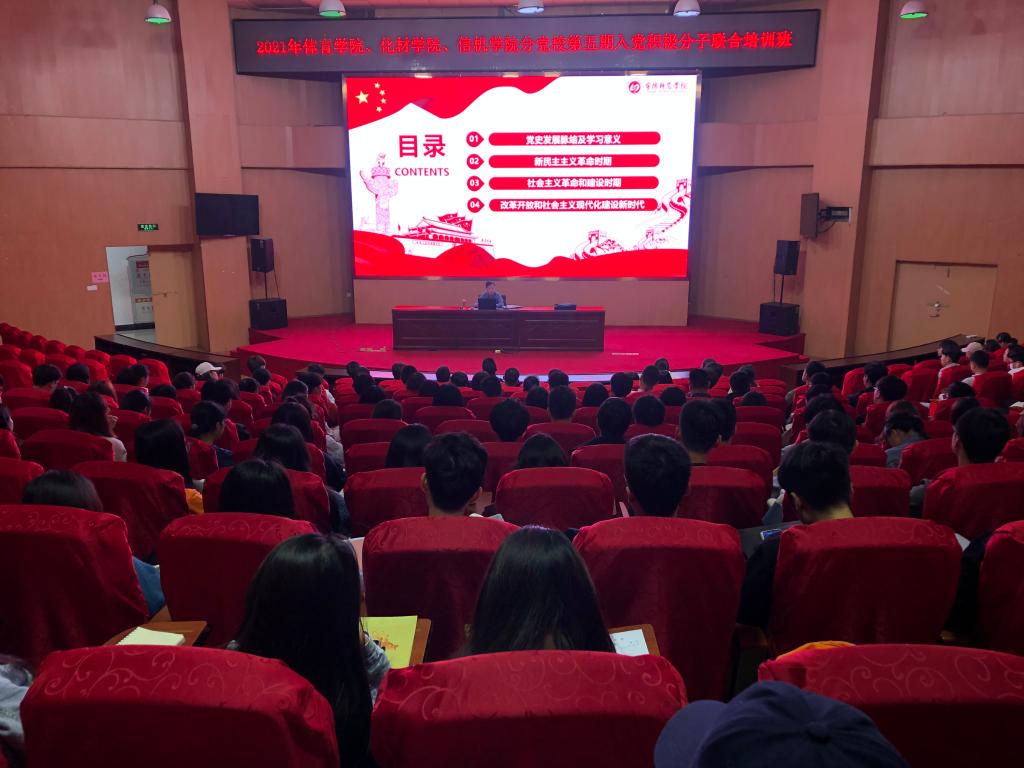 2021年4月16日,体育学院、化学与材料学院、信息与澳门电子pg游戏官网联合举办的第五期入党积极分子培训班在图书馆报告厅举行了开班仪式。
