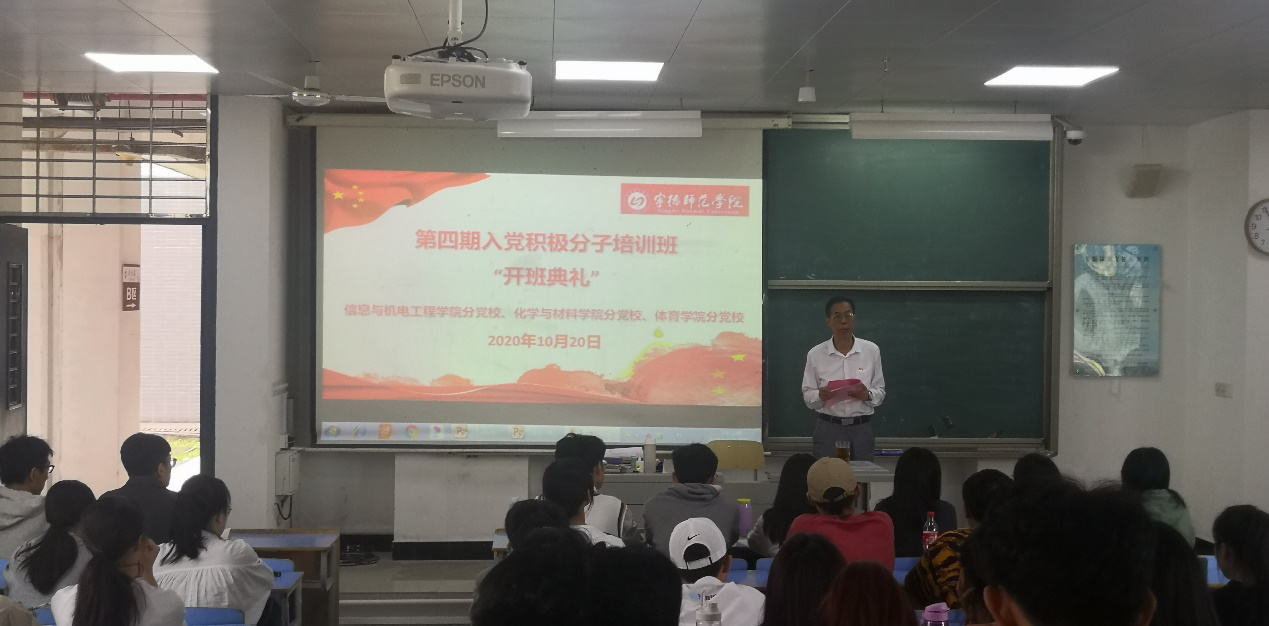 2020年10月20日下午,由澳门电子pg游戏官网党校信息与澳门电子pg游戏官网分党校、化学与材料学院分党校、体育学院分党校联合举办的第四期入党积极分子培训班在求是楼DB101教室正式开班。参加此次开班仪式的有信息与澳门电子pg游戏官网党委书记陈茂和及本期92名入党积极分子。陈茂和为全体学员作开班动员讲话并上党课——《中国共产党章程》。