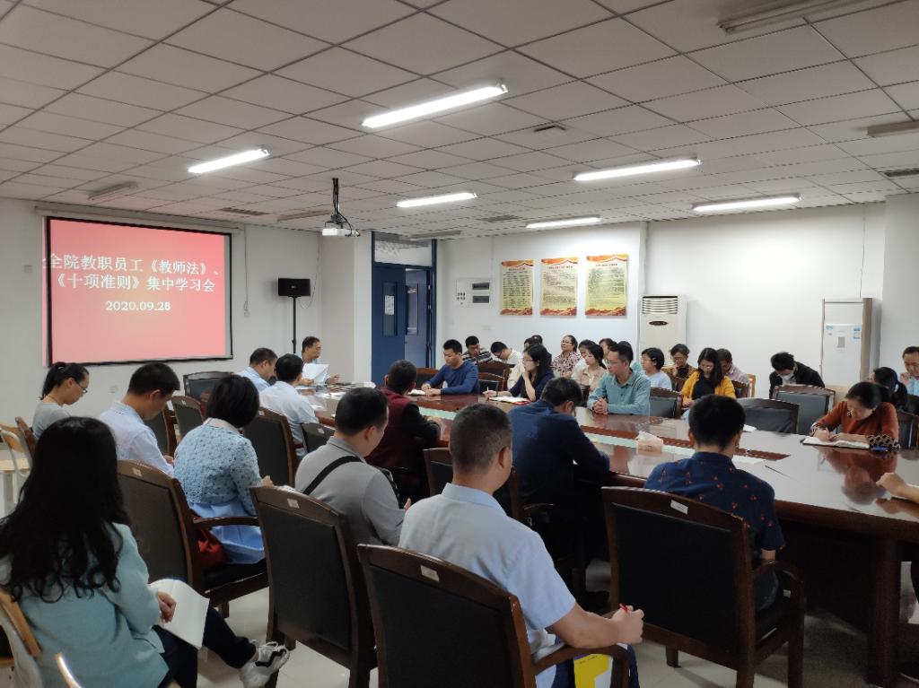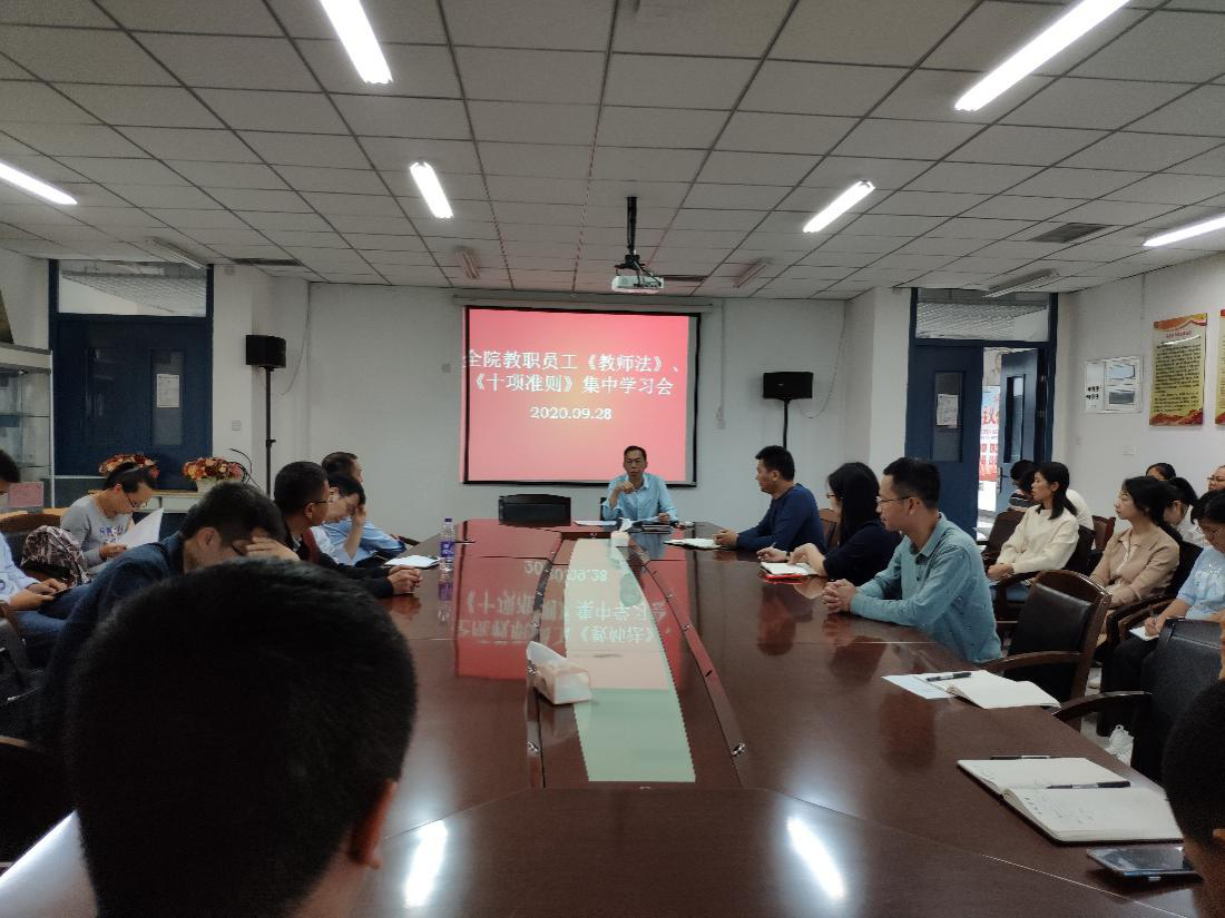 会上,院党委书记陈茂和同志带领全体参会教师学习了《教师法》、《新时代高校教师职业行为十项准则》、《学习习近平总书记教师节重要寄语精神》,陈书记强调指出,我们每一位教师都必须自觉加强师德修养,树立高尚的道德情操和精神追求,静下心来教书,潜下心来育人,以实际行动抵制一切外界干扰和诱惑,做“爱岗敬业,明理守法,教书育人,为人师表”的人民满意教师。