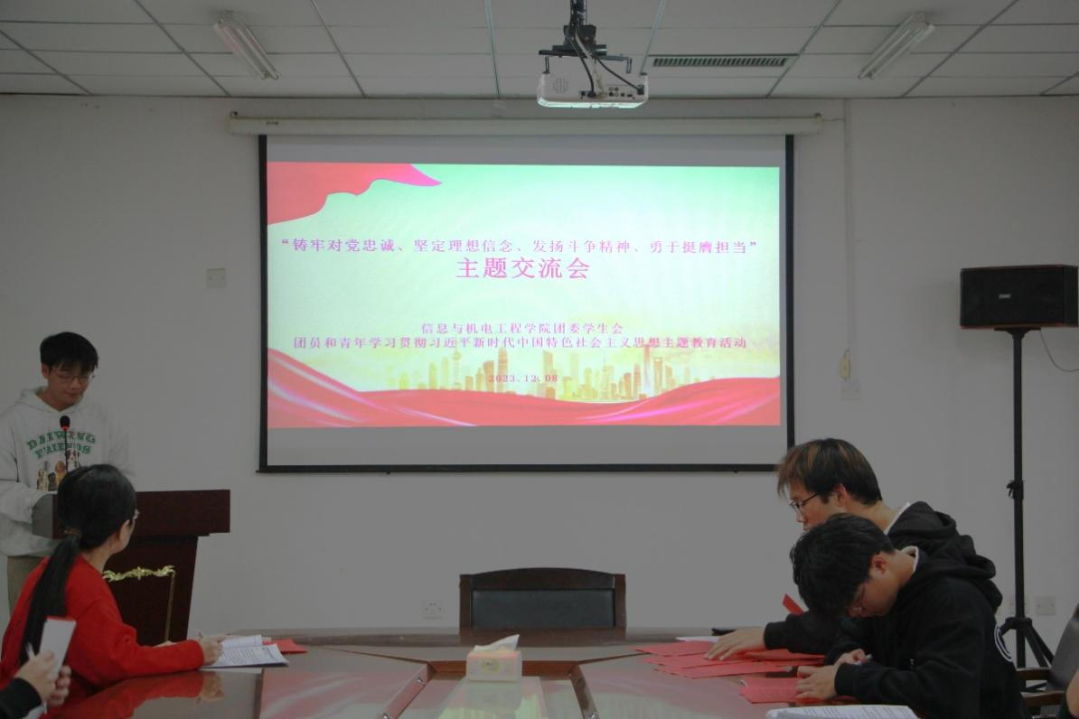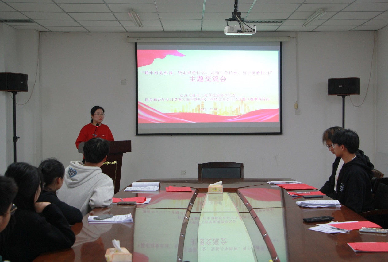 为深入推进团员和青年学习贯彻习近平新时代中国特色社会主义思想主题教育,充分发挥团员和青年积极分子和学生干部的先进骨干作用,弘扬和践行社会主义核心价值观,信息与澳门电子pg游戏官网团委学生会于2023年12月8日下午16时组织开展“铸牢对党忠诚、坚定理想信念、发扬斗争精神、勇于挺膺担当”主题交流会,信息与澳门电子pg游戏官网团委书记王佳佳出席会议,院团委学生会各部门负责人及学生会委员会委员参与本次交流。