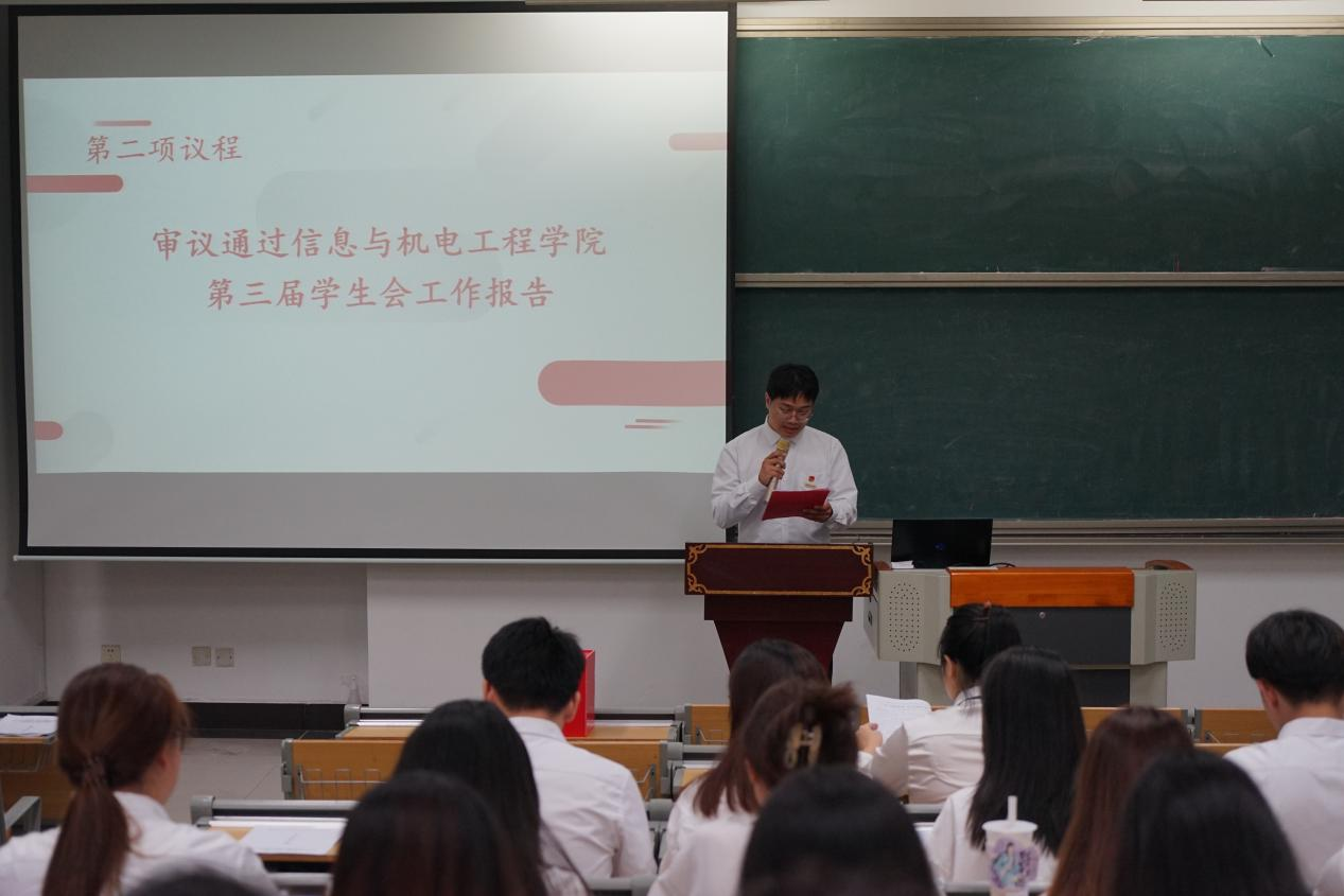会议在雄壮的国歌声拉开序幕,学生代表听取澳门电子学生会主席团成员陈炜文做的题为《初心如磐谱新篇,恒心永驻续华章》的工作报告,陈炜文同学详细介绍了学院学生会在过去一年的工作和对新一年工作的展望;他号召全院学生干部要更加深入学习贯彻习近平新时代中国特色社会主义思想,厚植家国情怀,涵养进取品格,以奋斗姿态激扬青春,不负时代,不负华年。工作报告获得了参会代表的一致通过。