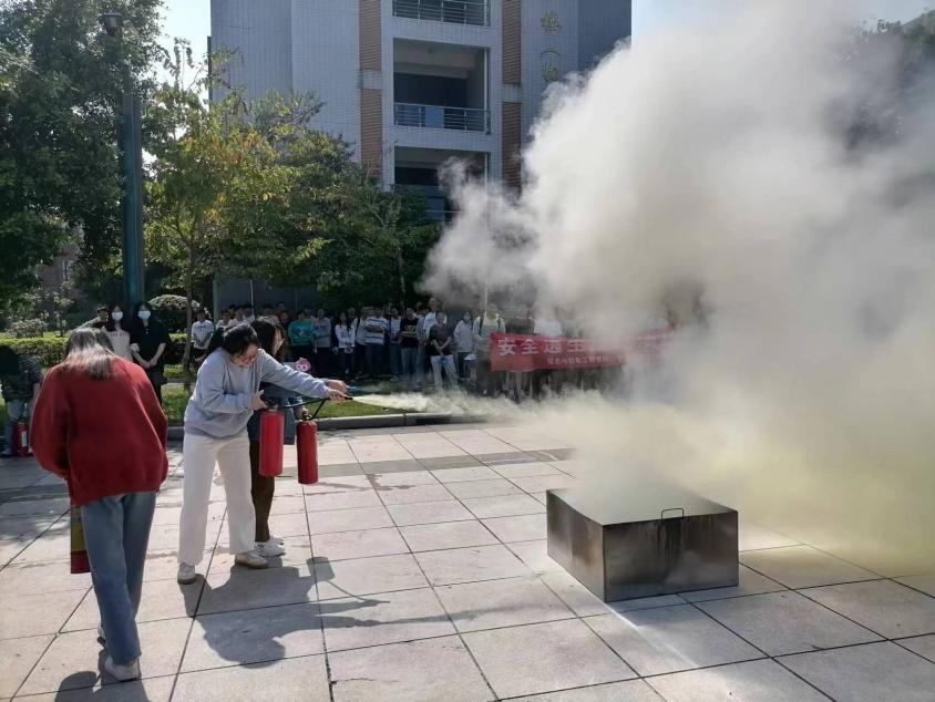演练结束后,参会人员在求索大道进行灭火实操训练。工作人员介绍了烟雾报警器、消火栓等消防设施识别特征及使用方法,并演示干粉灭火器操作使用方法,随后20多位学生代表现场操作灭火扑救。
