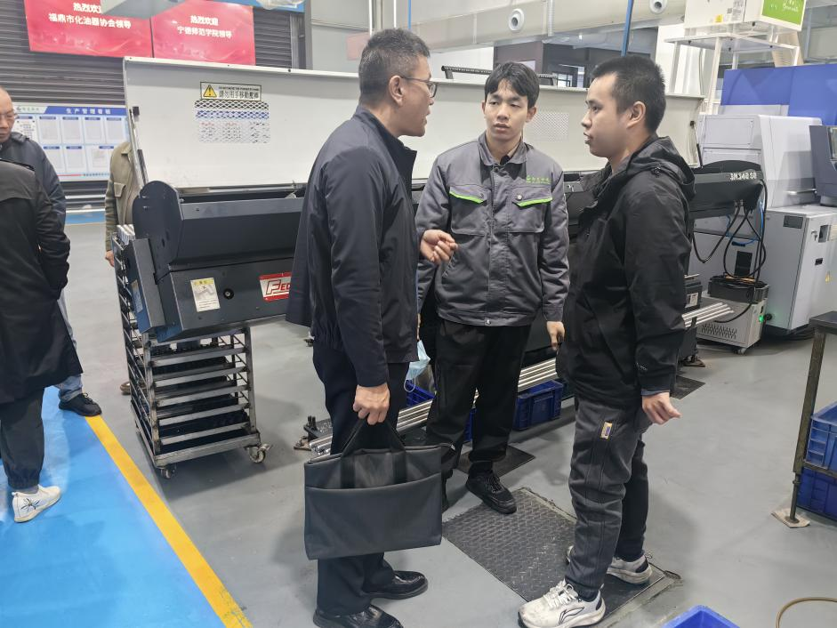 2025年,澳门电子pg游戏官网副院长王洪涛带领院学工办主任王佳佳、辅导员张春美、江铭俊,前往福鼎市劲龙机车部件有限公司亲切看望在此实习的2026届毕业生,在生产车间,王洪涛院长与实习生逐一交流,叮嘱大家严守安全规范,珍惜实践机会,将专业知识转化为实操能力。实习生们分享了实习感悟,感谢学院与企业的悉心安排。