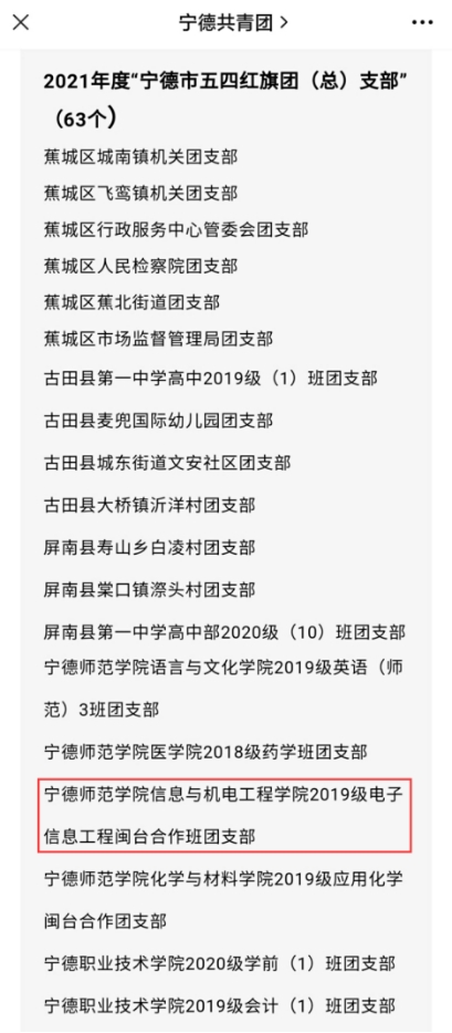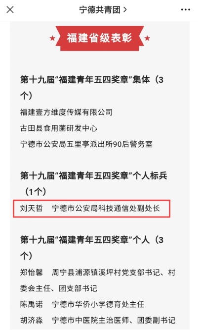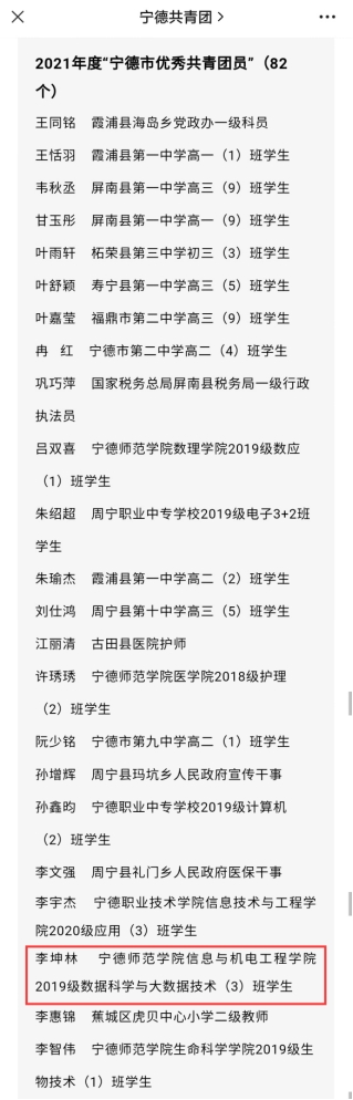 为迎接党的二十大胜利召开、庆祝建团100周年,在五四青年节当天,共青团中央、共青团福建省委和共青团宁德市委集中表彰(表扬)了宁德市124个先进集体和256个先进个人。澳门电子兼职教授、宁德市公安局科技通信处副处长刘天哲同志荣获第十九届“福建青年五四奖章”个人标兵;2019级电子信息工程闽台合作班团支部荣获2021年度“宁德市五四红旗团(总)支部”称号;2019级数据科学与大数据技术(3)班李坤林同学荣获2021年度“宁德市优秀共青团员”称号。
